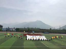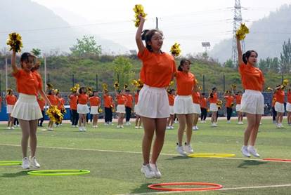 的队员们成三角之形舞动起来,金色的花球熠熠生辉,彰显建科活力;轻快的步调整齐划一,尽显建科动感。三角形是一种最为稳固的结构,以此作为开场,不仅展现了他们上下一心,稳如磐石的团结精神。而且阵型似“山”而立,突显力拔山兮气盖世的气势之余,更加坚定了他们积土成山,积水成渊的坚定步伐。