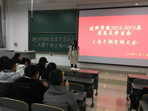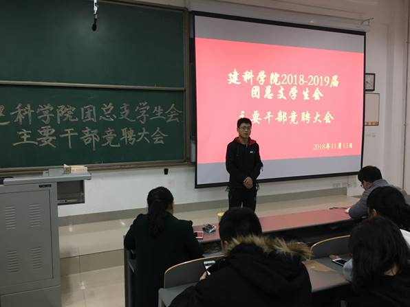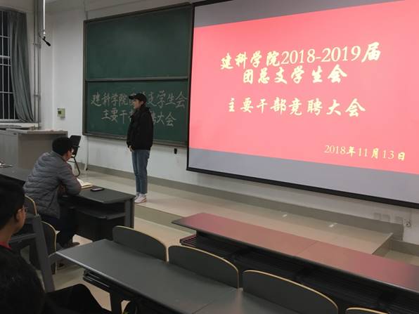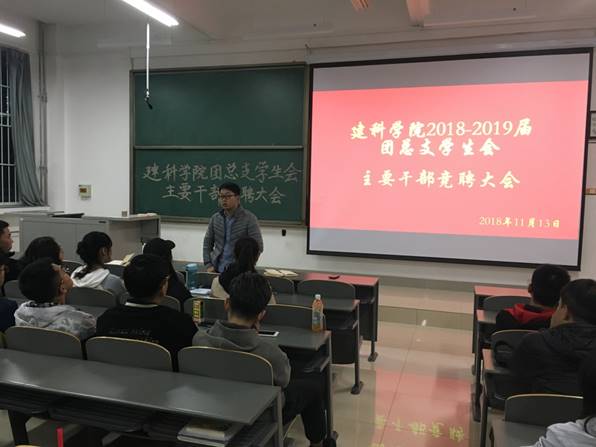 2018-2019届团总支学生会主要干部竞聘大会。参加大会的有2017级本科生辅导员王翼杰、2018级本科生辅导员朱海琦以及2017级团支部成员。