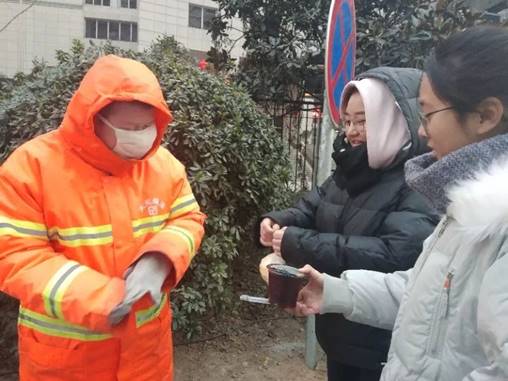 环卫工人伴着月色已经开始了辛勤的工作,此时,建环四班部分同学也已分为十个小组,寻找在这座城市忙碌的身影,准备为他们送出热腾腾的爱心早餐,并帮助环卫工人清扫路面。在交谈过程中,同学们了解到在寂静的大街上还未有行人的身影时,环卫工人早已拿着簸箕奔走在城市的大街小巷。早餐对他们而言,也仿佛只是一顿加餐,当温暖的早餐被递到他们手上时,同学们看到他们皲裂的手紧紧握着早饭,也正是他们纯朴的笑温暖着我们,更温暖着城市里所有的人。他们桔红色的工作服在路灯的辉映下,闪烁出点点的光芒。