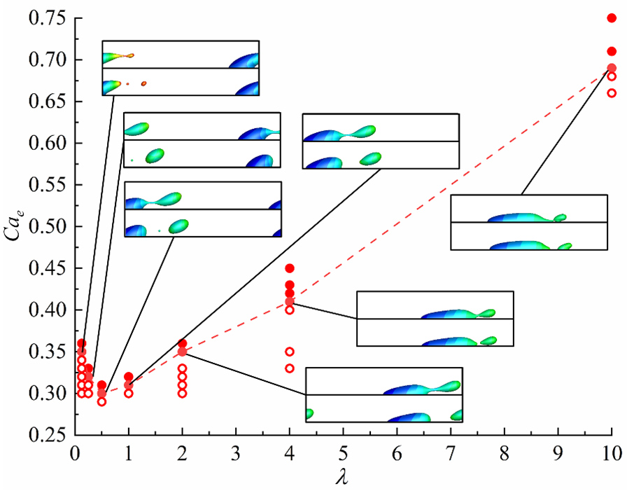 图1不同粘性比下干净液滴的破裂临界毛细数