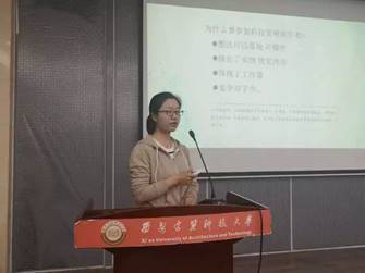 紧接着,于延磊同学为大家进行了“大挑”科技类竞赛经验分享。首先,于延磊同学以竞赛思路开头,就专业知识的结合、指导老师的帮助、队伍组合等基础条件进行经验交流。其中重点提出了科技竞赛贵在坚持这个观点,提醒大家合理分配时间,切勿耽搁学业。