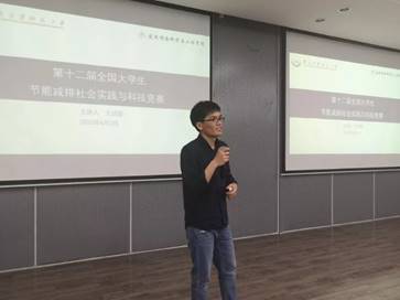 然后,王成哲同学先从个人能力、未来出路、知识储存等方面系统地为大家列举说明了参加科技竞赛对自身能力的提升以及在社会竞争中自身所处的优势面。随后,他为大家仔细讲解了何为大学生节能减排竞赛,也提醒同学们在竞赛准备、实施过程、作品完成三个阶段中所要注意的问题及相应方法。